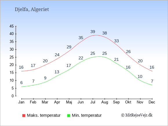 Graferne viser de gennemsnitlige maksimale temperaturer i Djelfa og København (typisk når solen står højest på himmelen om eftermiddagen) og de gennemsnitlige minimale temperaturer (typisk den laveste temperatur som måles om natten).