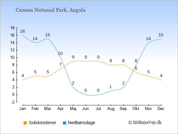 Grafen viser antallet af solskinstimer i Cameia National Park (d.v.s. det gennemsnitlige antal timer pr. dag hvor solen skinner), samt antallet af nedbørsdage (d.v.s. det gennemsnitlige antal dage i en given måned,
