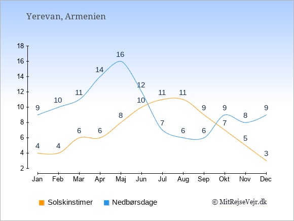 Grafen viser antallet af solskinstimer i Yerevan (d.v.s. det gennemsnitlige antal timer pr. dag hvor solen skinner), samt antallet af nedbørsdage (d.v.s. det gennemsnitlige antal dage i en given måned,