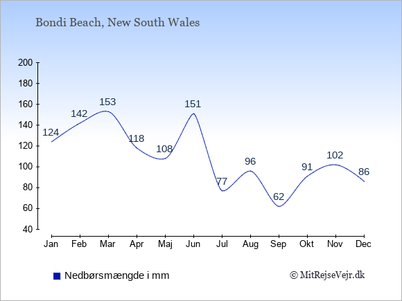 Vejret i Bondi Beach er som regel bedst i de måneder, hvor der er mange solskinstimer og få nedbørsdage.