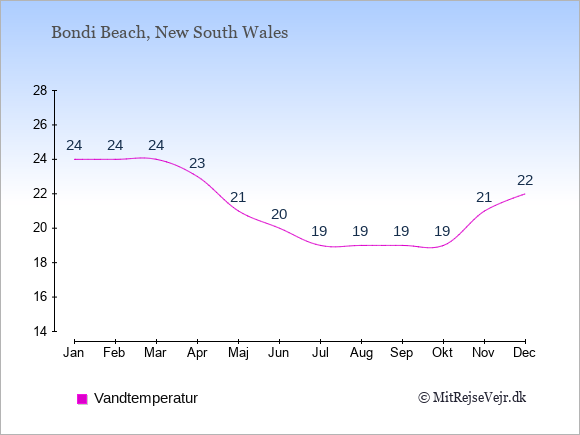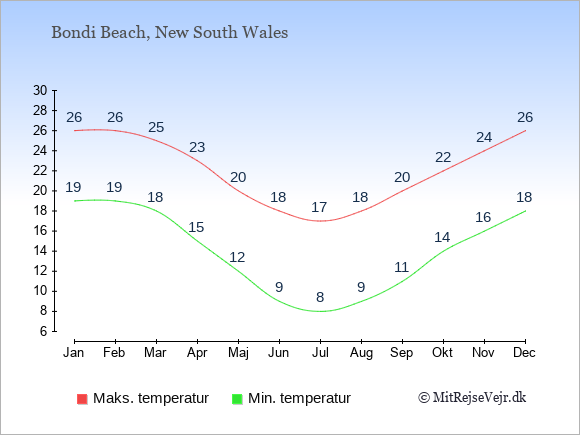 Grafen viser de gennemsnitlige maksimale temperaturer i Bondi Beach (som oftest den værdi, der er målt midt på dagen) og de gennemsnitlige minimale temperaturer (som oftest den værdi, der er målt midt om natten).