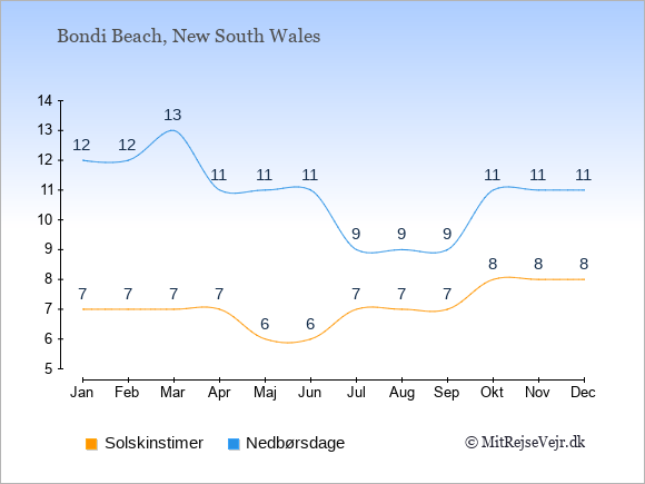 Grafen viser antallet af solskinstimer i Bondi Beach (d.v.s. det gennemsnitlige antal timer pr. dag hvor solen skinner), samt antallet af nedbørsdage (d.v.s. det gennemsnitlige antal dage i en given måned,