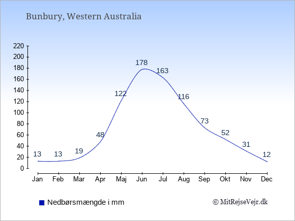 Hvis du vil se, hvordan vejret i Bunbury adskiller sig fra vejret derhjemme, kan du sammenligne tallene måned for måned med de tilsvarende tal for Danmark under Bunbury: klima & vejr.