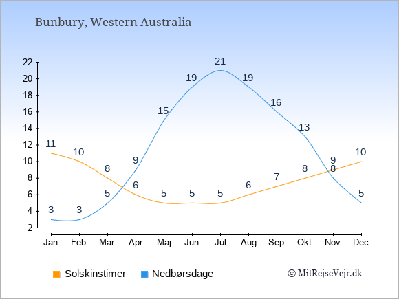 Grafen viser antallet af solskinstimer i Bunbury (d.v.s. det gennemsnitlige antal timer pr. dag hvor solen skinner), samt antallet af nedbørsdage (d.v.s. det gennemsnitlige antal dage i en given måned,