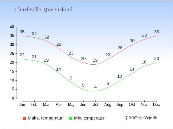 Grafen viser de gennemsnitlige maksimale temperaturer i Charleville (som oftest den værdi, der er målt midt på dagen) og de gennemsnitlige minimale temperaturer (som oftest den værdi, der er målt midt om natten).