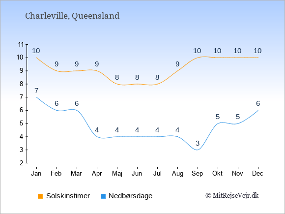 Grafen viser antallet af solskinstimer i Charleville (d.v.s. det gennemsnitlige antal timer pr. dag hvor solen skinner), samt antallet af nedbørsdage (d.v.s. det gennemsnitlige antal dage i en given måned,