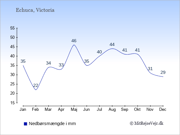 Hvis du vil se, hvordan vejret i Echuca adskiller sig fra vejret derhjemme, kan du sammenligne tallene måned for måned med de tilsvarende tal for Danmark under Echuca: klima & vejr.
