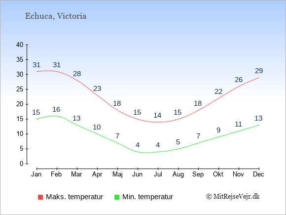 Grafen viser de gennemsnitlige maksimale temperaturer i Echuca (som oftest den værdi, der er målt midt på dagen) og de gennemsnitlige minimale temperaturer (som oftest den værdi, der er målt midt om natten).