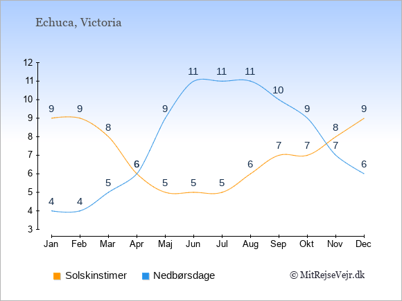 Grafen viser antallet af solskinstimer i Echuca (d.v.s. det gennemsnitlige antal timer pr. dag hvor solen skinner), samt antallet af nedbørsdage (d.v.s. det gennemsnitlige antal dage i en given måned,