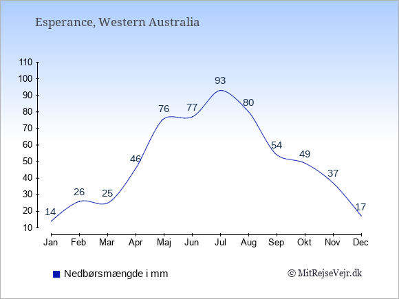 Hvis du vil se, hvordan vejret i Esperance adskiller sig fra vejret derhjemme, kan du sammenligne tallene måned for måned med de tilsvarende tal for Danmark under Esperance: klima & vejr.