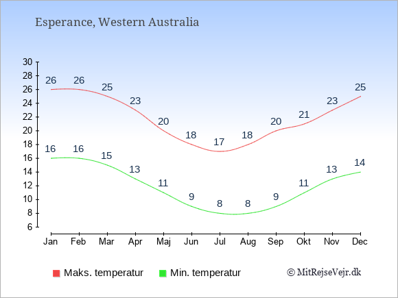 Grafen viser de gennemsnitlige maksimale temperaturer i Esperance (som oftest den værdi, der er målt midt på dagen) og de gennemsnitlige minimale temperaturer (som oftest den værdi, der er målt midt om natten).