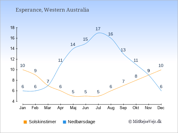 Grafen viser antallet af solskinstimer i Esperance (d.v.s. det gennemsnitlige antal timer pr. dag hvor solen skinner), samt antallet af nedbørsdage (d.v.s. det gennemsnitlige antal dage i en given måned,