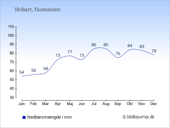 Hvis du vil se, hvordan vejret i Hobart adskiller sig fra vejret derhjemme, kan du sammenligne tallene måned for måned med de tilsvarende tal for Danmark under Hobart: klima & vejr.