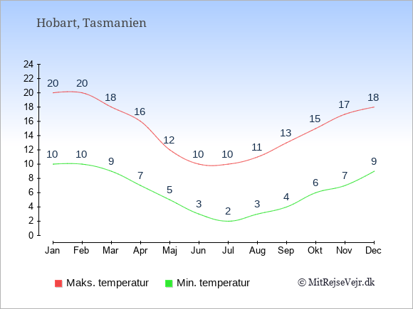Grafen viser de gennemsnitlige maksimale temperaturer i Hobart (som oftest den værdi, der er målt midt på dagen) og de gennemsnitlige minimale temperaturer (som oftest den værdi, der er målt midt om natten).