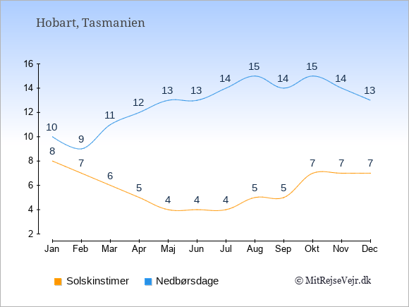 Grafen viser antallet af solskinstimer i Hobart (d.v.s. det gennemsnitlige antal timer pr. dag hvor solen skinner), samt antallet af nedbørsdage (d.v.s. det gennemsnitlige antal dage i en given måned,