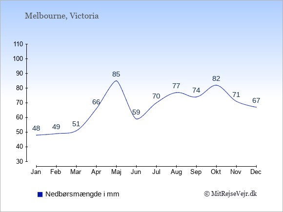 Hvis du vil se, hvordan vejret i Melbourne adskiller sig fra vejret derhjemme, kan du sammenligne tallene måned for måned med de tilsvarende tal for Danmark under Melbourne: klima & vejr.