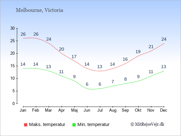 Grafen viser de gennemsnitlige maksimale temperaturer i Melbourne (som oftest den værdi, der er målt midt på dagen) og de gennemsnitlige minimale temperaturer (som oftest den værdi, der er målt midt om natten).