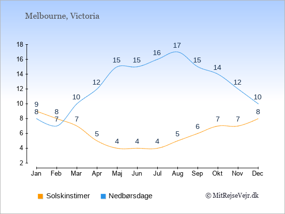 Grafen viser antallet af solskinstimer i Melbourne (d.v.s. det gennemsnitlige antal timer pr. dag hvor solen skinner), samt antallet af nedbørsdage (d.v.s. det gennemsnitlige antal dage i en given måned,