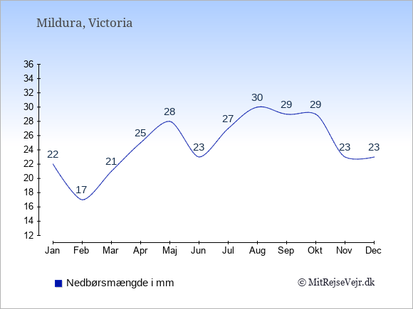 Hvis du vil se, hvordan vejret i Mildura adskiller sig fra vejret derhjemme, kan du sammenligne tallene måned for måned med de tilsvarende tal for Danmark under Mildura: klima & vejr.