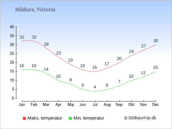 Grafen viser de gennemsnitlige maksimale temperaturer i Mildura (som oftest den værdi, der er målt midt på dagen) og de gennemsnitlige minimale temperaturer (som oftest den værdi, der er målt midt om natten).