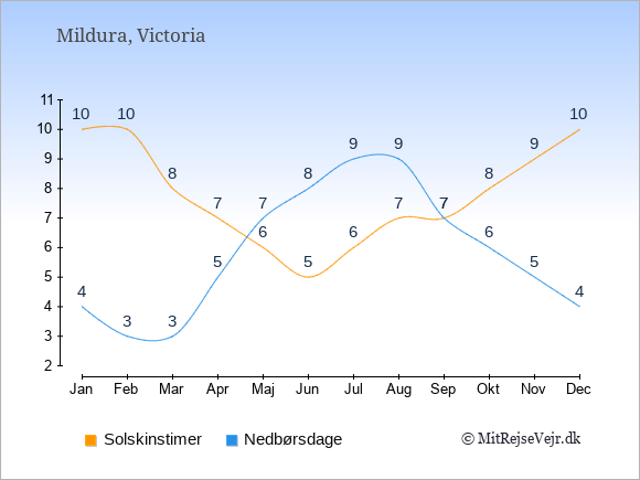 Grafen viser antallet af solskinstimer i Mildura (d.v.s. det gennemsnitlige antal timer pr. dag hvor solen skinner), samt antallet af nedbørsdage (d.v.s. det gennemsnitlige antal dage i en given måned,