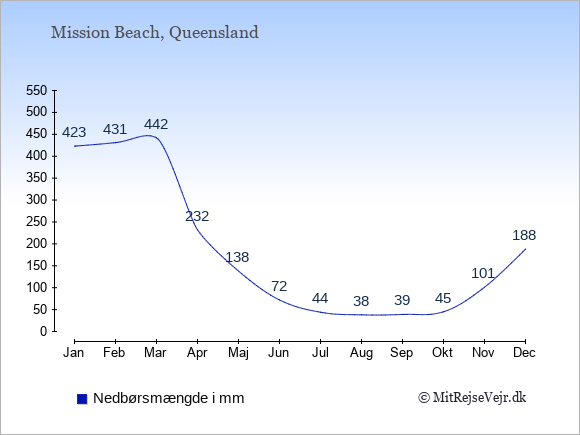 Vejret i Mission Beach er som regel bedst i de måneder, hvor der er mange solskinstimer og få nedbørsdage.