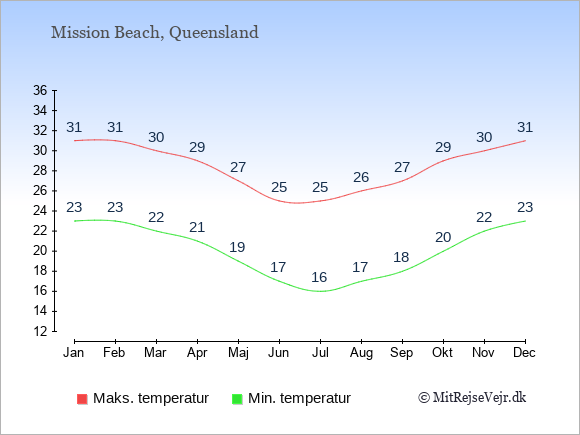 Grafen viser de gennemsnitlige maksimale temperaturer i Mission Beach (som oftest den værdi, der er målt midt på dagen) og de gennemsnitlige minimale temperaturer (som oftest den værdi, der er målt midt om natten).