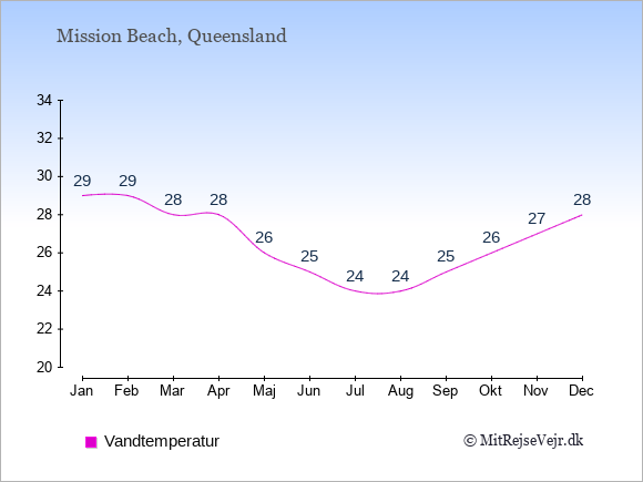 Du kan også se vejrudsigten for Mission Beach med den aktuelle vandtemperatur her: Vejrudsigt Mission Beach, vejret lige nu.