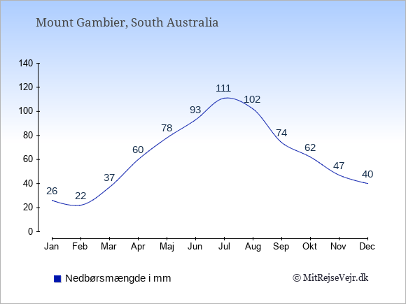 Hvis du vil se, hvordan vejret i Mount Gambier adskiller sig fra vejret derhjemme, kan du sammenligne tallene måned for måned med de tilsvarende tal for Danmark under Mount Gambier: klima & vejr.