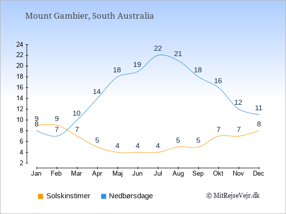 Grafen viser antallet af solskinstimer i Mount Gambier (d.v.s. det gennemsnitlige antal timer pr. dag hvor solen skinner), samt antallet af nedbørsdage (d.v.s. det gennemsnitlige antal dage i en given måned,