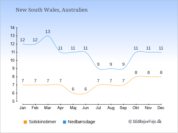 Grafen viser antallet af solskinstimer i New South Wales (d.v.s. det gennemsnitlige antal timer pr. dag hvor solen skinner), samt antallet af nedbørsdage (d.v.s. det gennemsnitlige antal dage i en given måned,