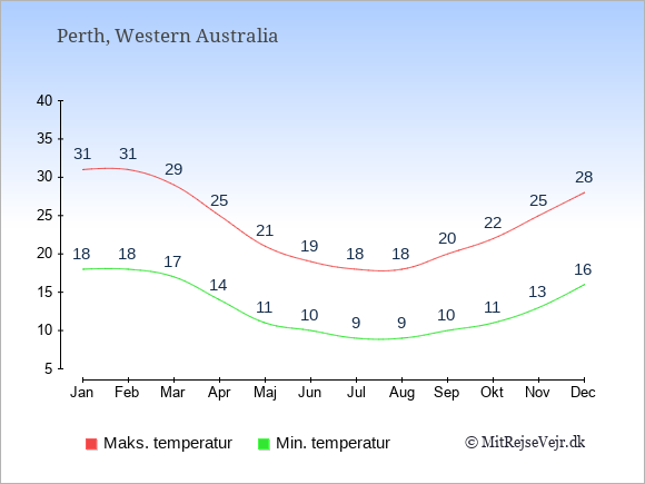 Grafen viser de gennemsnitlige maksimale temperaturer i Perth (som oftest den værdi, der er målt midt på dagen) og de gennemsnitlige minimale temperaturer (som oftest den værdi, der er målt midt om natten).