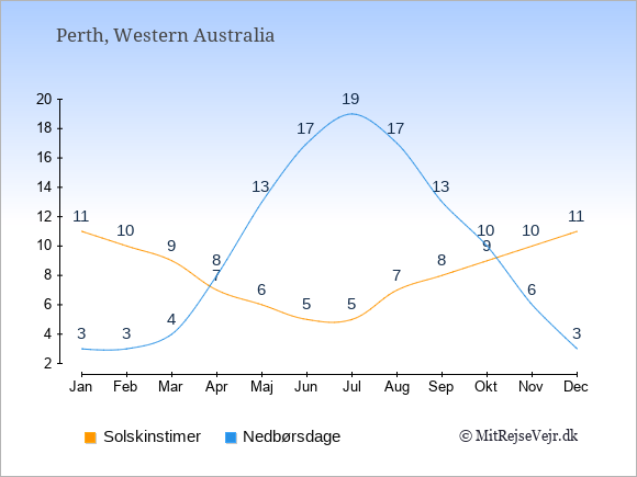 Grafen viser antallet af solskinstimer i Perth (d.v.s. det gennemsnitlige antal timer pr. dag hvor solen skinner), samt antallet af nedbørsdage (d.v.s. det gennemsnitlige antal dage i en given måned,