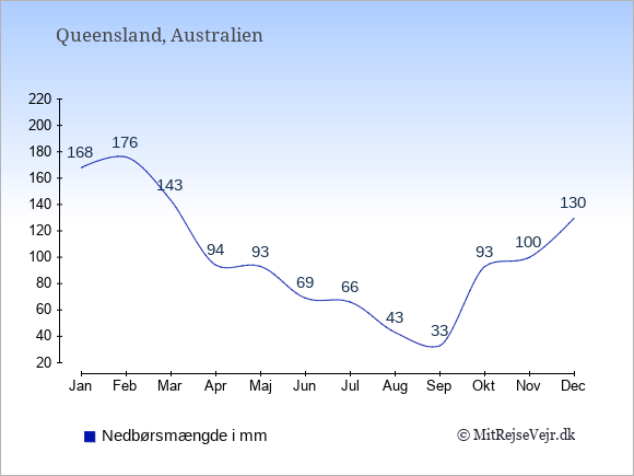 Hvis du vil se, hvordan vejret i Queensland adskiller sig fra vejret derhjemme, kan du sammenligne tallene måned for måned med de tilsvarende tal for Danmark under Queensland: klima & vejr.