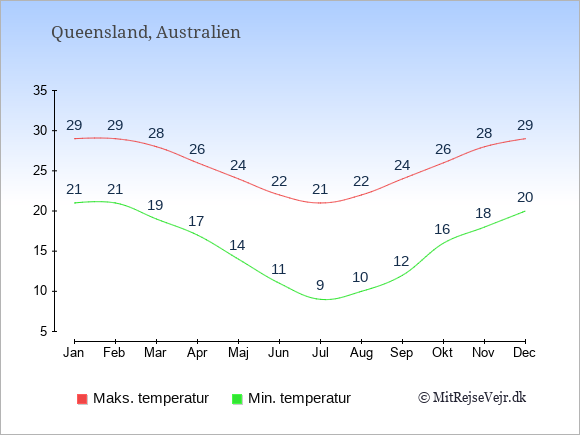 Grafen viser de gennemsnitlige maksimale temperaturer i Queensland (som oftest den værdi, der er målt midt på dagen) og de gennemsnitlige minimale temperaturer (som oftest den værdi, der er målt midt om natten).