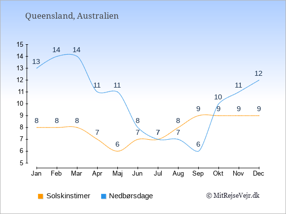 Grafen viser antallet af solskinstimer i Queensland (d.v.s. det gennemsnitlige antal timer pr. dag hvor solen skinner), samt antallet af nedbørsdage (d.v.s. det gennemsnitlige antal dage i en given måned,