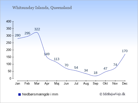 Hvis du vil se, hvordan vejret på Whitsunday Islands adskiller sig fra vejret derhjemme, kan du sammenligne tallene måned for måned med de tilsvarende tal for Danmark under Whitsunday Islands: klima & vejr.