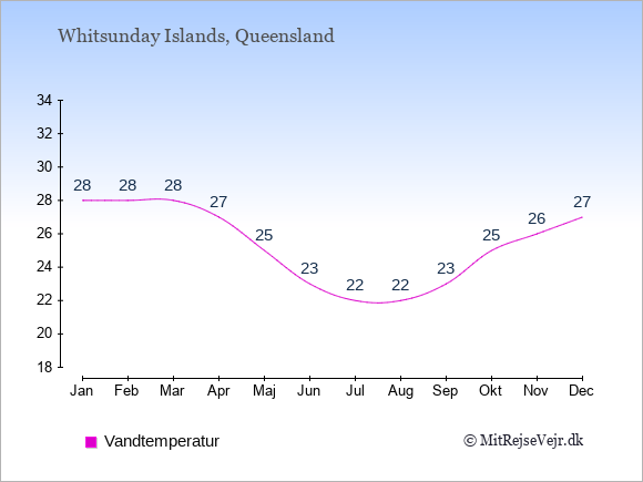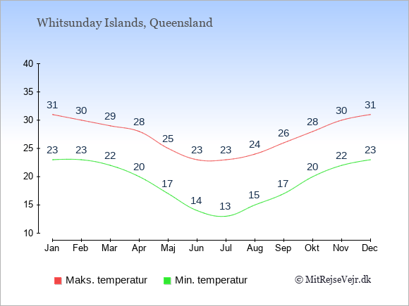 Grafen viser de gennemsnitlige maksimale temperaturer på Whitsunday Islands (som oftest den værdi, der er målt midt på dagen) og de gennemsnitlige minimale temperaturer (som oftest den værdi, der er målt midt om natten).