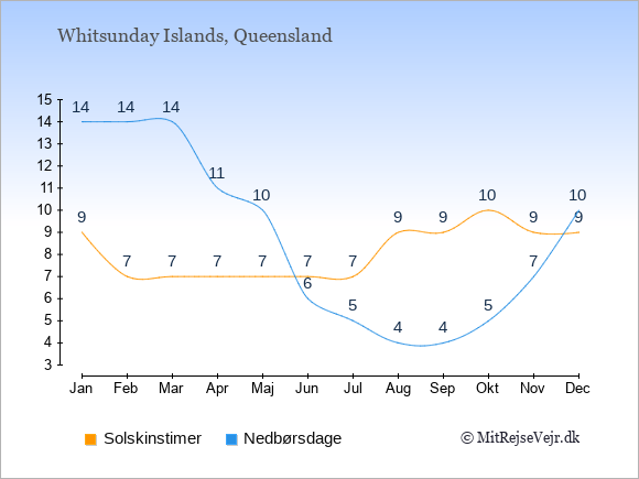 Grafen viser antallet af solskinstimer på Whitsunday Islands (d.v.s. det gennemsnitlige antal timer pr. dag hvor solen skinner), samt antallet af nedbørsdage (d.v.s. det gennemsnitlige antal dage i en given måned,