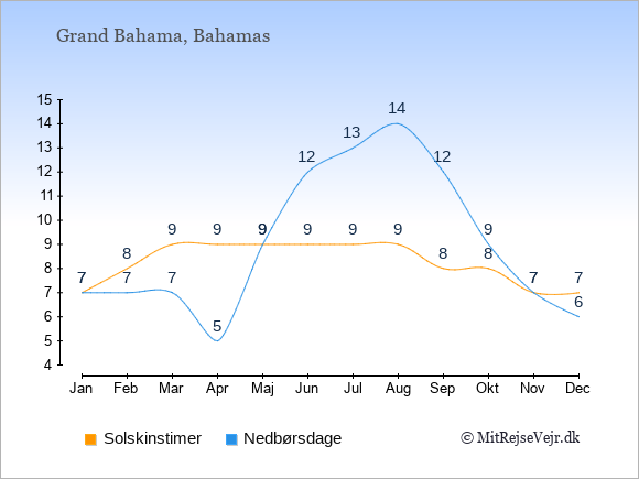 Graferne viser det gennemsnitlige antal solskinstimer på Grand Bahama pr. dag samt det gennemsnitlige antal dage med nedbør på Grand Bahama sammenlignet med København.