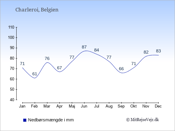Se klimadata for Charleroi sammenlignet med klimaet i Danmark.