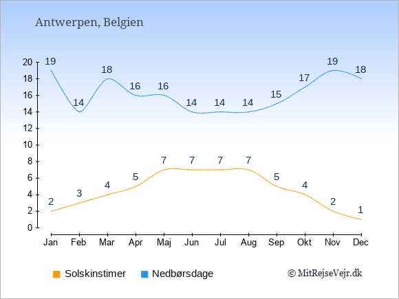 Grafen viser antallet af solskinstimer i Antwerpen (d.v.s. det gennemsnitlige antal timer pr. dag hvor solen skinner), samt antallet af nedbørsdage (d.v.s. det gennemsnitlige antal dage i en given måned,