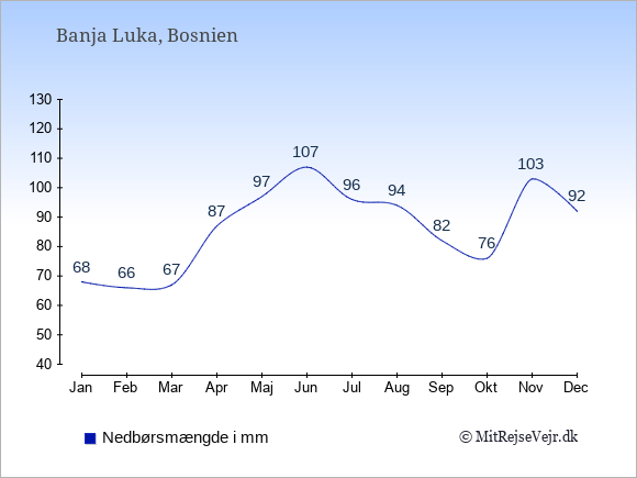 Hvis du vil se, hvordan vejret i Banja Luka adskiller sig fra vejret derhjemme, kan du sammenligne tallene måned for måned med de tilsvarende tal for Danmark under Banja Luka: klima & vejr.