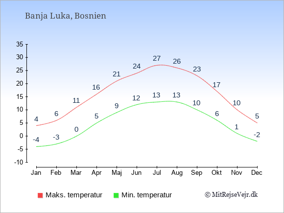 Grafen viser de gennemsnitlige maksimale temperaturer i Banja Luka (som oftest den værdi, der er målt midt på dagen) og de gennemsnitlige minimale temperaturer (som oftest den værdi, der er målt midt om natten).