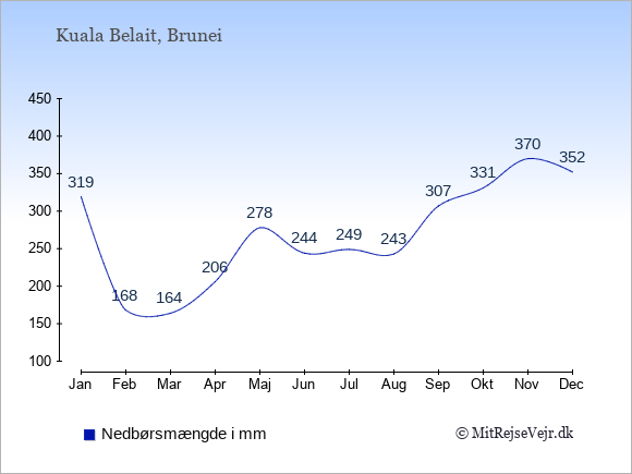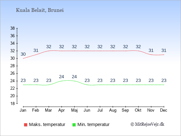 Grafen viser de gennemsnitlige maksimale temperaturer i Kuala Belait (som oftest den værdi, der er målt midt på dagen) og de gennemsnitlige minimale temperaturer (som oftest den værdi, der er målt midt om natten).