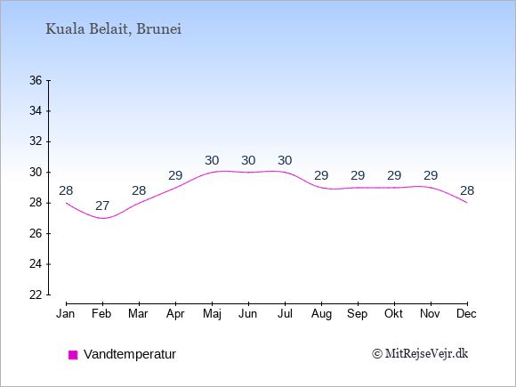 Få et samlet overblik over vejret i Kuala Belait året rundt med temperaturer, vandtemperatur, solskinstimer og nedbør.