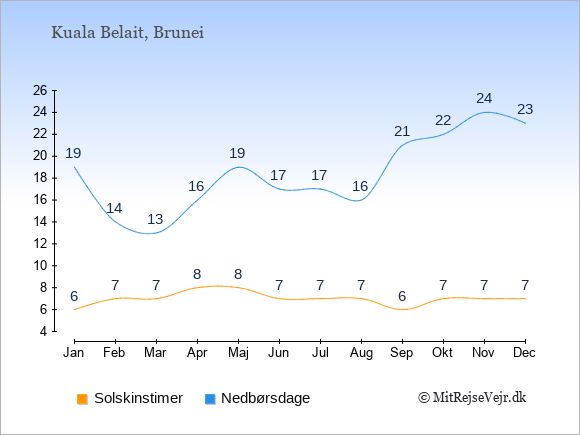 Grafen viser antallet af solskinstimer i Kuala Belait (d.v.s. det gennemsnitlige antal timer pr. dag hvor solen skinner), samt antallet af nedbørsdage (d.v.s. det gennemsnitlige antal dage i en given måned,