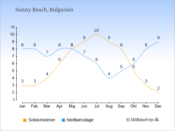 Grafen viser antallet af solskinstimer i Sunny Beach (d.v.s. det gennemsnitlige antal timer pr. dag hvor solen skinner), samt antallet af nedbørsdage (d.v.s. det gennemsnitlige antal dage i en given måned,