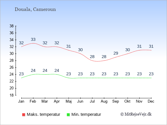 Grafen viser de gennemsnitlige maksimale temperaturer i Douala (som oftest den værdi, der er målt midt på dagen) og de gennemsnitlige minimale temperaturer (som oftest den værdi, der er målt midt om natten).
