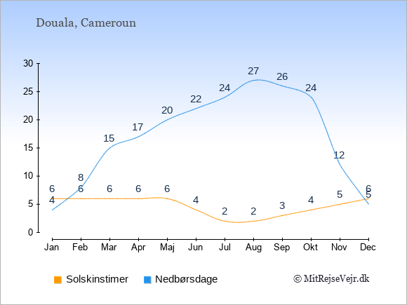 Grafen viser antallet af solskinstimer i Douala (d.v.s. det gennemsnitlige antal timer pr. dag hvor solen skinner), samt antallet af nedbørsdage (d.v.s. det gennemsnitlige antal dage i en given måned,